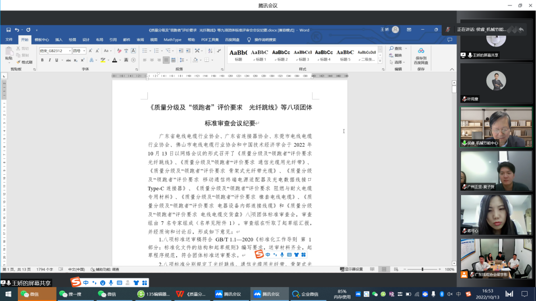 广东省电线电缆行业协会、广东省连接器协会、东莞市电线电缆行业协会和中国技术经济学会于2022年10月13日以网络会议的形式召开了《质量分级及“领跑者”评价要求 移动通信终端电源适配器及充电数据线接口Type-C连接器》等十项团体标准审查会。审查组由7名专家组成,谷源强担任审查组组长。会议由中国标准化研究院资环分院领跑者办公室主任管金鑫主持。